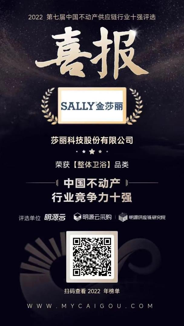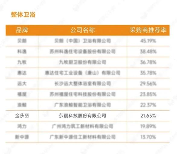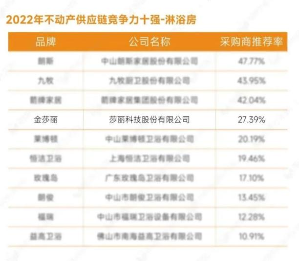 在開發(fā)商實(shí)名推薦、合作案例、中標(biāo)數(shù)據(jù)、制造實(shí)力、專家評審等環(huán)節(jié)均名列前茅,莎麗科技股份有限公司(下文簡稱“金莎麗”)強(qiáng)勢入選整體衛(wèi)浴榜單TOP10與淋浴房品類榜單TOP10,行業(yè)影響力再一次得到彰顯。